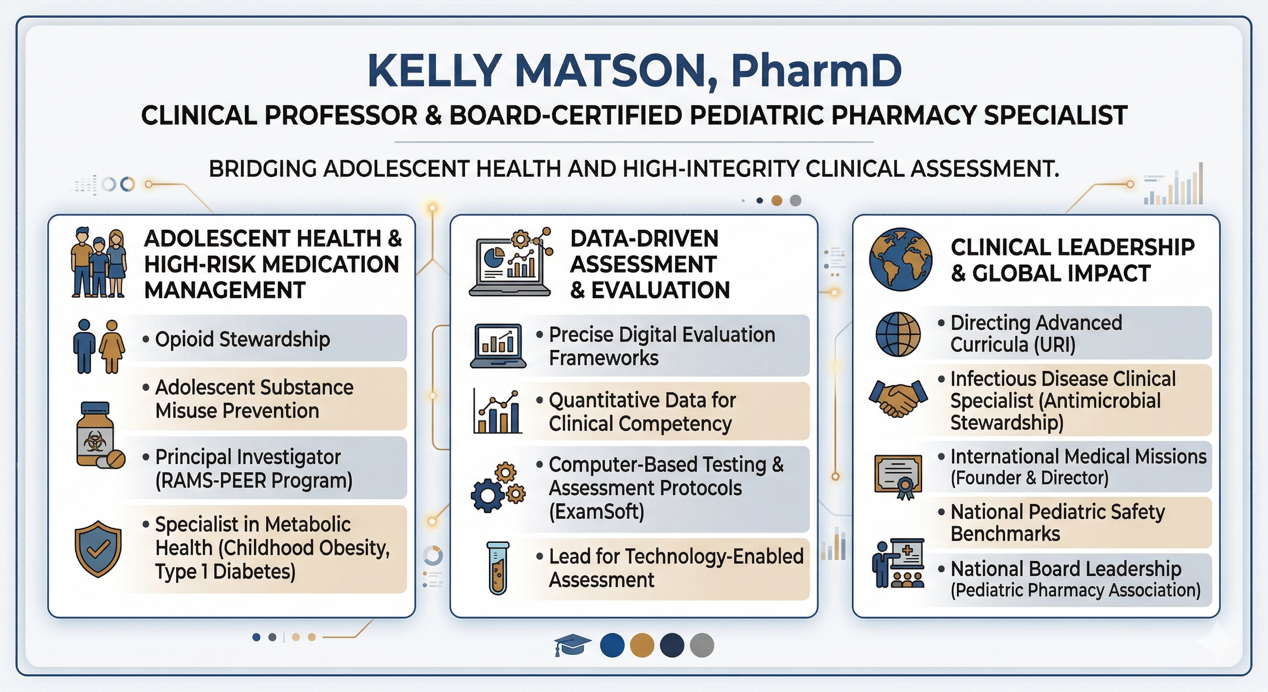 Kelly Matson, PharmD, is a Clinical Professor and Board-Certified Pediatric Pharmacy Specialist. Her work focuses on the intersection of adolescent health and the implementation of high-integrity clinical assessment. She serves as a national authority on the management of high-risk medication therapies in youth populations, specifically regarding opioid stewardship and metabolic health. Her focus is on ensuring that clinical programs are supported by both evidence-based outreach strategies and precise digital evaluation frameworks.
